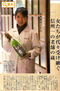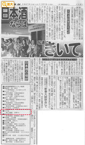 | 「女利き酒師 オススメ銘柄」 (2007/11/7 夕刊フジ) ![]() 【清酒 川中島】が紹介されました。 |
